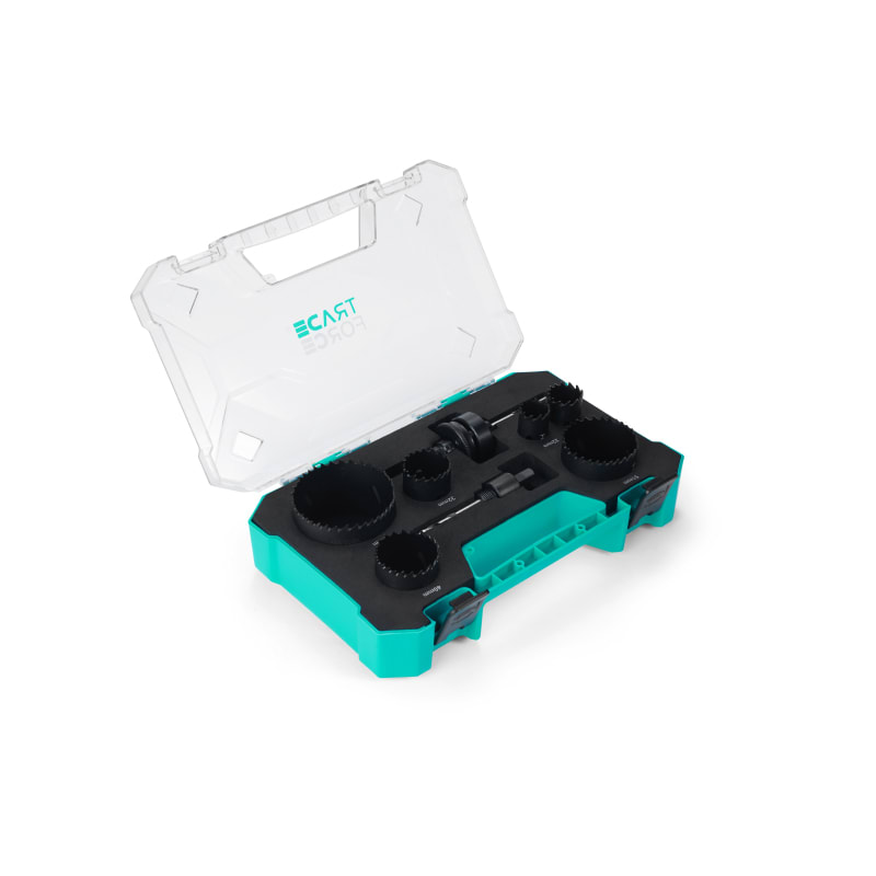 1 Kit con 1 valigetta in plastica, 1pz codolo esagonale 11mm, 1pz codolo esagonale 9.5mm e 6 seghe a tazza: HSS con 8% Cobalto, misure: diametro 22/25/32/40/51/67mm. profondità di taglio: 44mm
