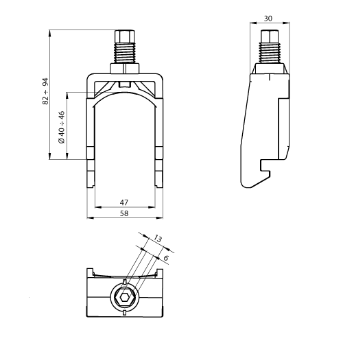 Elemento per il fissaggio di cavi o tubi (di diametro compreso tra 40 e 46 mm) al traversino della Passerella a traversini isolante 67, al Profilato isolante e al Supporto per tetto 60355-48. Montaggio agevole, senza bulloni. Materiale isolante, senza alogeni. Colore: grigio RAL 7038.