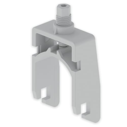Elemento per il fissaggio di cavi o tubi (di diametro compreso tra 46 e 52 mm) al traversino della Passerella a traversini isolante 67, al Profilato isolante e al Supporto per tetto 60355-48. Montaggio agevole, senza bulloni. Materiale isolante, senza alogeni. Colore: grigio RAL 7038.