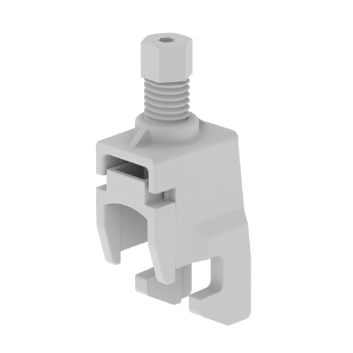 Elemento per il fissaggio di cavi o tubi (di diametro compreso tra 8 e 12 mm) al traversino della Passerella a traversini isolante 67, al Profilato isolante e al Supporto per tetto 60355-48. Montaggio agevole, senza bulloni. Materiale isolante, senza alogeni. Colore: grigio RAL 7038.