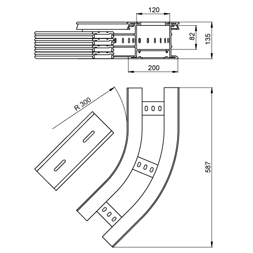 Curva piana per realizzare cambi di direzione di 45°. Si raccomanda di collocare staffe sotto le curve. Raggio di curvatura: 300 mm. Include i giunti di unione necessari al montaggio. Materiale isolante. Colore: grigio RAL 7035.