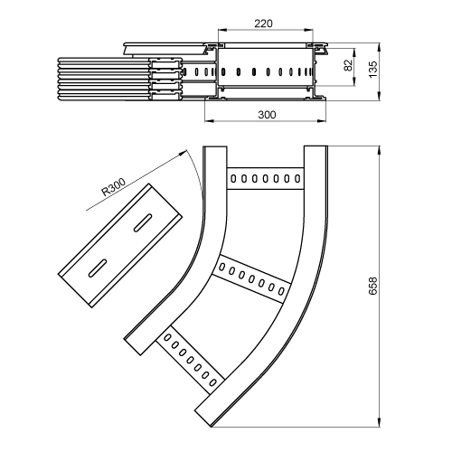 Curva piana per realizzare cambi di direzione di 45°. Si raccomanda di collocare staffe sotto le curve. Raggio di curvatura: 300 mm. Include i giunti di unione necessari al montaggio. Materiale isolante. Colore: grigio RAL 7035.