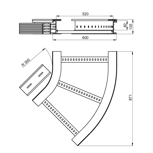 Curva piana per realizzare cambi di direzione di 45°. Si raccomanda di collocare staffe sotto le curve. Raggio di curvatura: 300 mm. Include i giunti di unione necessari al montaggio. Materiale isolante. Colore: grigio RAL 7035.