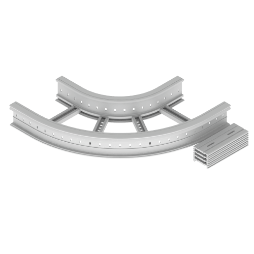 Curva piana per realizzare cambi di direzione di 90°. Si raccomanda di collocare staffe sotto le curve. Raggio di curvatura: 300 mm. Include i giunti di unione necessari al montaggio. Materiale isolante. Colore: grigio RAL 7035.