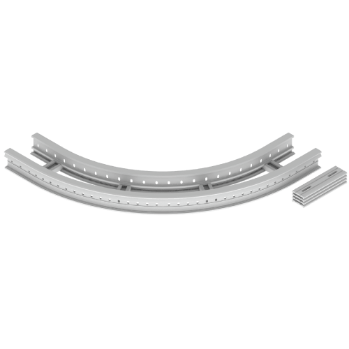 Curva piana per realizzare cambi di direzione di 90°. Si raccomanda di collocare staffe sotto le curve. Raggio di curvatura: 600 mm. Include i giunti di unione necessari al montaggio. Materiale isolante. Colore: grigio RAL 7035.