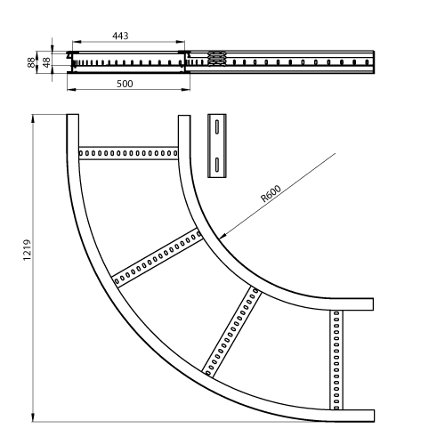 Curva piana per realizzare cambi di direzione di 90°. Si raccomanda di collocare staffe sotto le curve. Raggio di curvatura: 600 mm. Include i giunti di unione necessari al montaggio. Materiale isolante. Colore: grigio RAL 7035.