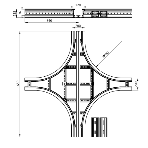 Elemento per realizzare incroci tra due tratti rettilinei di passerella a traversini. Raggio di curvatura di 600 mm. Include i giunti di unione necessari al montaggio. Materiale isolante. Colore: grigio RAL 7035.