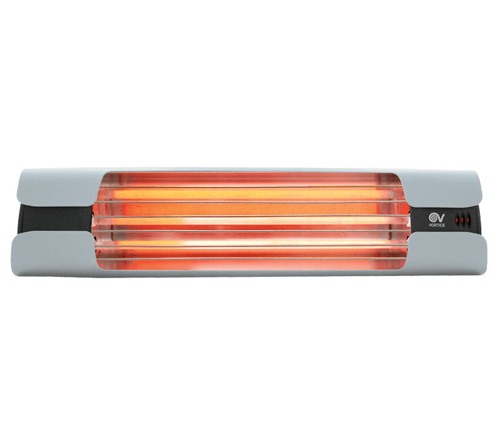 VORTICE - Thermologika design: lampade a raggi infrarossi con fianchi in alluminio nero, gusci grigio chiaro, griglia inox, staffa verniciata.