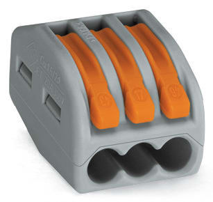 Connettore di giunzione CLASSIC. per tutti i tipi di conduttore. max. 4 mm2. 3 conduttori. con leve. scatola grigia. Temperatura ambiente: max. 40 °C. 2,50 mm2. grigio