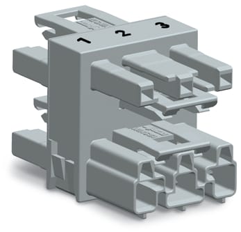 connettore distribuzione a 3 vie. 3 poli. Cod. B. 1 ingresso. 3 uscite. grigio