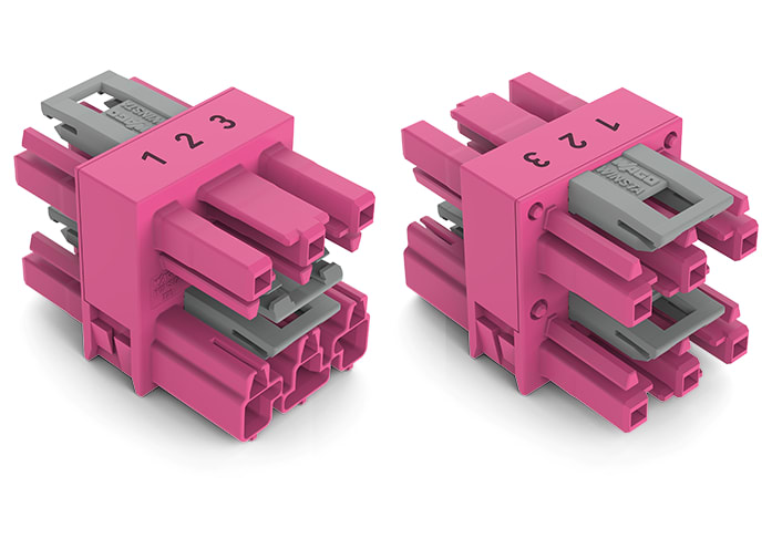 connettore distribuzione a 3 vie. 3 poli. Cod. B. 1 ingresso. 3 uscite. rosa