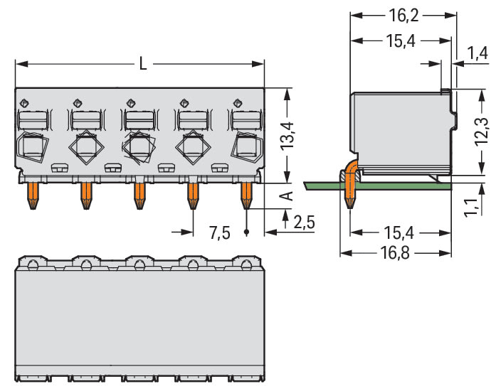Connettore femmina 1 cond. THT, ang.. pulsante. Push-in CAGE CLAMP®. 2,5 mm2. Passo pin 7,5 mm. 2 poli. Pin a saldare Ø 1,4 mm. 2,50 mm2. grigio chiaro