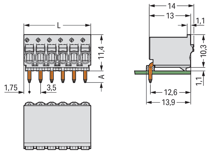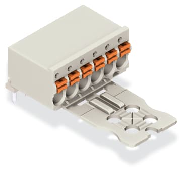 Connettore femmina 1 cond. THT, ang.. pulsante. Push-in CAGE CLAMP®. 1,5 mm2. Passo pin 3,5 mm. 12 poli. Pin a saldare 1 mm Ø. Piastra di fermo. 1,50 mm2. grigio chiaro
