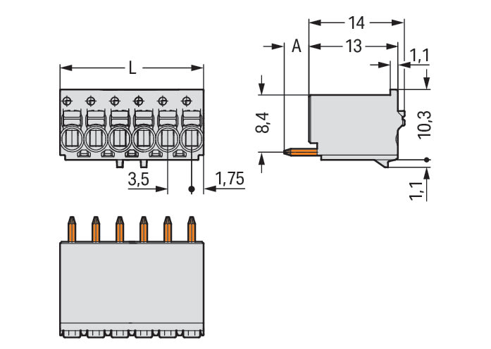Connettore femmina 1 cond. THT, dritt.. pulsante. Push-in CAGE CLAMP®. 1,5 mm2. Passo pin 3,5 mm. 3 poli. Pin a saldare 1 mm Ø. Piastra di fermo. 1,50 mm2. grigio chiaro