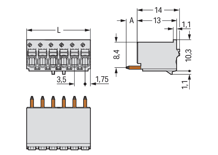 Connettore femmina 1 cond. THT, dritt.. pulsante. Push-in CAGE CLAMP®. 1,5 mm2. Passo pin 3,5 mm. 3 poli. Pin a saldare 1 mm Ø. 1,50 mm2. grigio chiaro