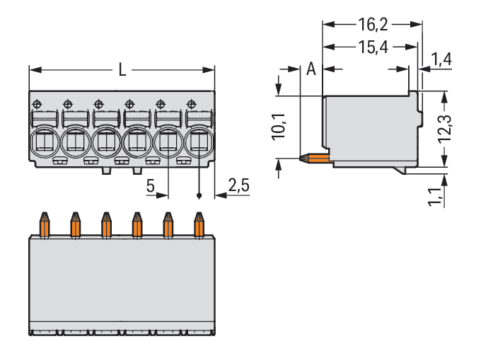 Connettore femmina 1 cond. THT, dritt.. pulsante. Push-in CAGE CLAMP®. 2,5 mm2. Passo pin 5 mm. 3 poli. Pin a saldare Ø 1,4 mm. Piastra di fermo. 2,50 mm2. grigio chiaro