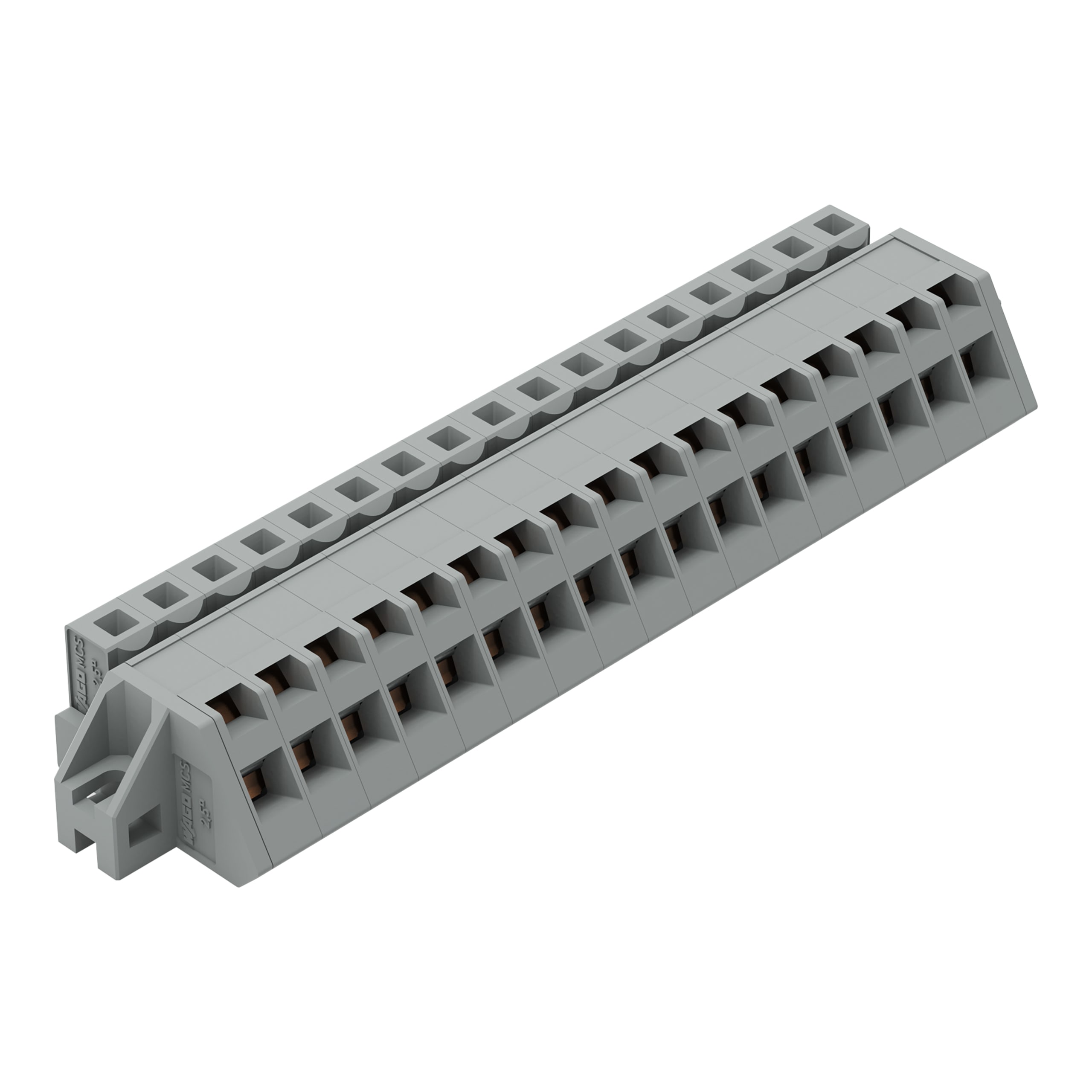 Connettore femmina 1 conduttore, ang.. CAGE CLAMP®. 2,5 mm2. Passo pin 5 mm. 17 poli. collare di fissaggio. Montaggio su guida DIN 35/pannello. 2,50 mm2. grigio