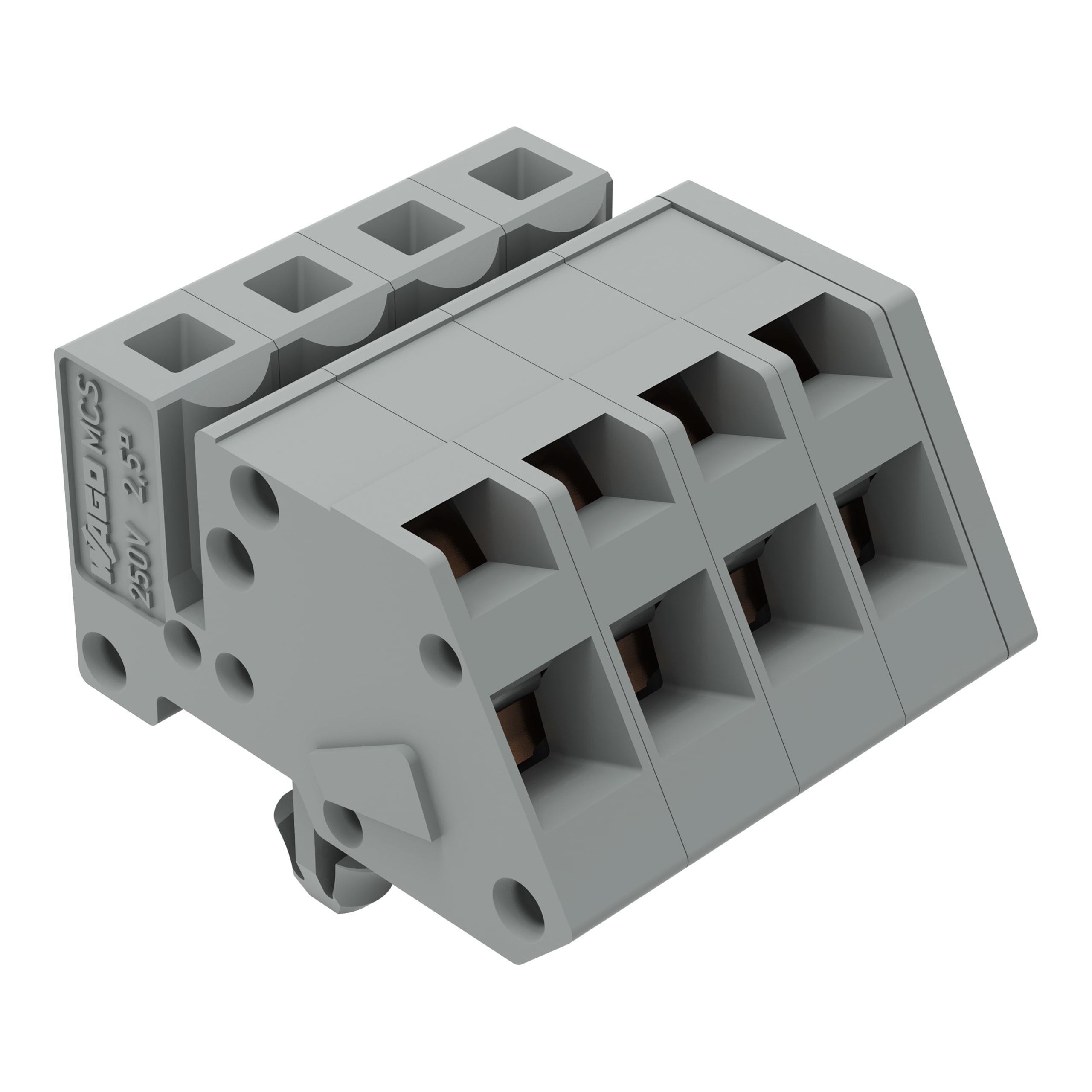 Connettore femmina 1 conduttore, ang.. CAGE CLAMP®. 2,5 mm2. Passo pin 5 mm. 4 poli. Piedi di fissaggio a scatto. 2,50 mm2. grigio