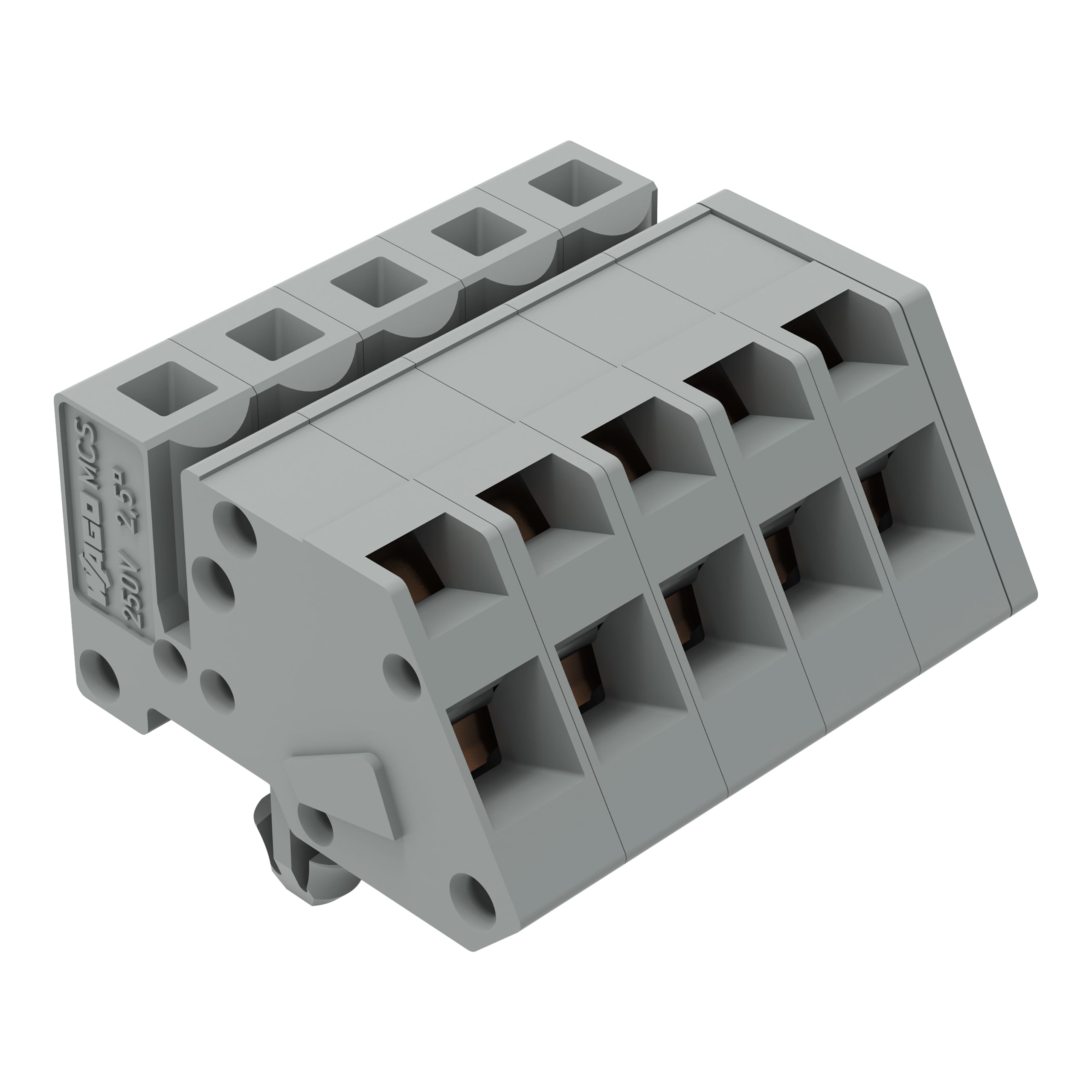 Connettore femmina 1 conduttore, ang.. CAGE CLAMP®. 2,5 mm2. Passo pin 5 mm. 5 poli. Piedi di fissaggio a scatto. 2,50 mm2. grigio