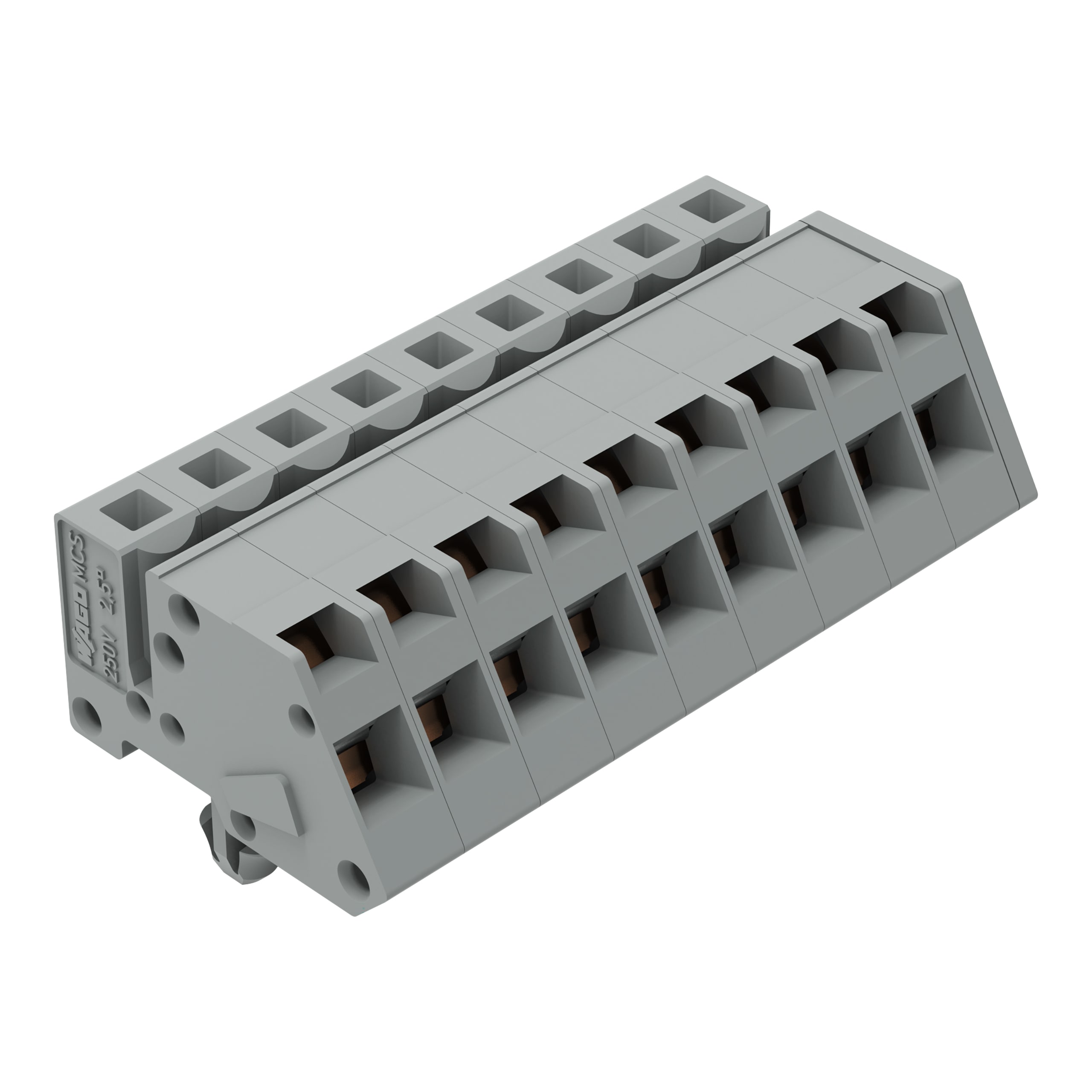 Connettore femmina 1 conduttore, ang.. CAGE CLAMP®. 2,5 mm2. Passo pin 5 mm. 9 poli. Piedi di fissaggio a scatto. 2,50 mm2. grigio
