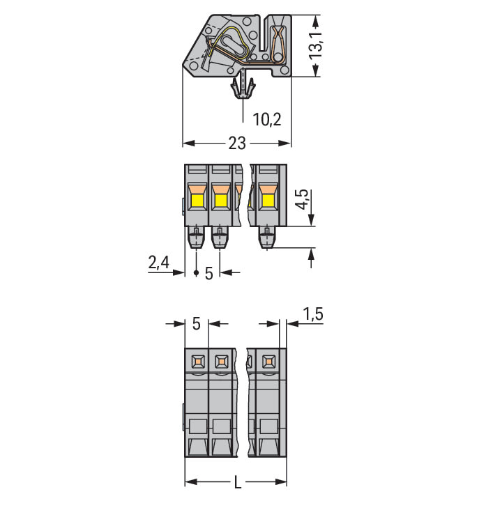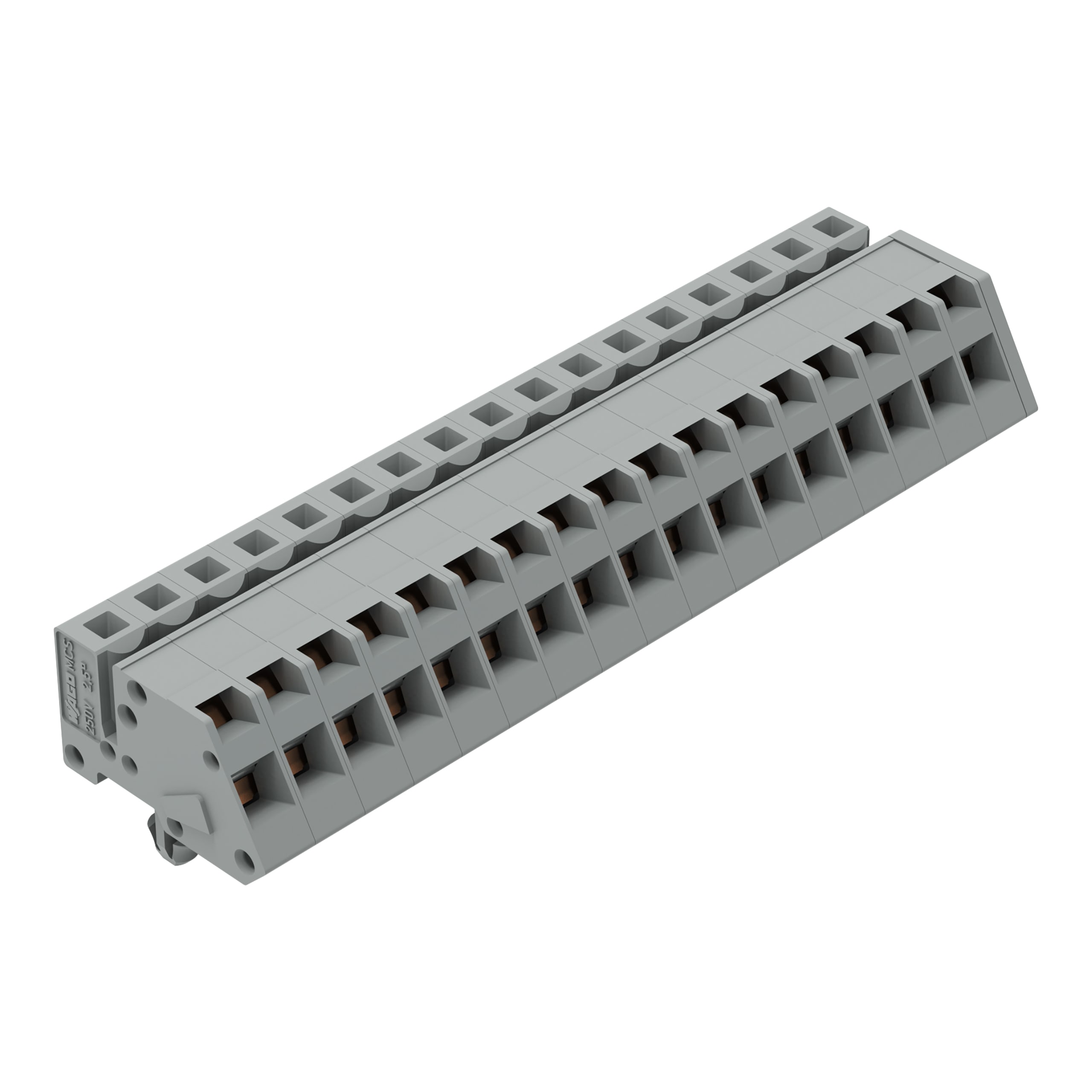 Connettore femmina 1 conduttore, ang.. CAGE CLAMP®. 2,5 mm2. Passo pin 5 mm. 17 poli. Piedi di fissaggio a scatto. 2,50 mm2. grigio