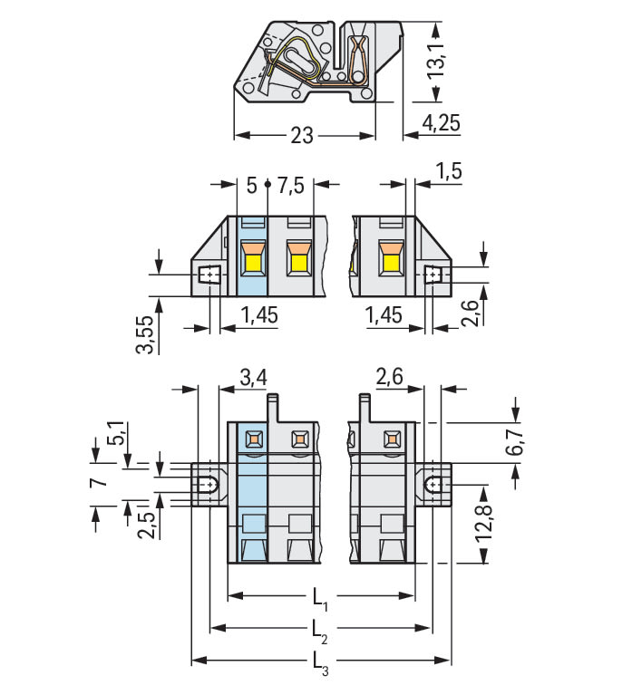 Connettore femmina 1 conduttore, ang.. CAGE CLAMP®. 2,5 mm2. Passo pin 7,5 mm. 11 poli. Protetto al 100% contro l'inversione di polarità. collare di fissaggio. 2,50 mm2. grigio chiaro