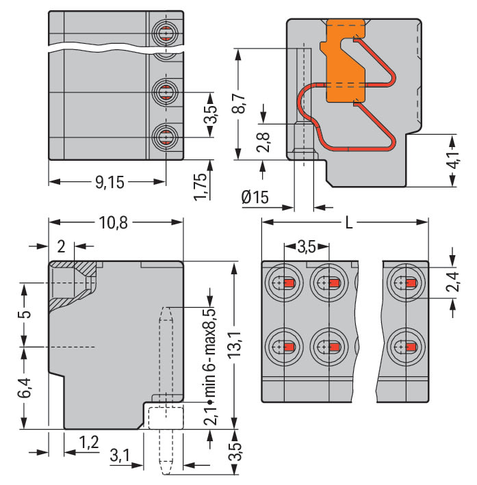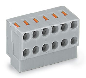 Connettore femmina per 2 conduttori. pulsante. PUSH WIRE®. Ø 0,8 mm. Passo pin 3,5 mm. 8 poli. per striscia di pin a saldare. 0,50 mm2. grigio