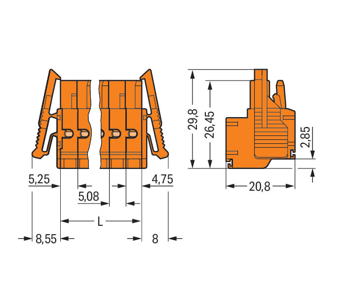 Connettore femmina per 2 conduttori. Push-in CAGE CLAMP®. 2,5 mm2. Passo pin 5,08 mm. 6 poli. Leve di bloccaggio laterali. 2,50 mm2. arancione