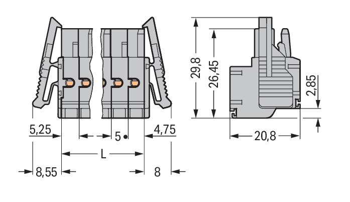 Connettore femmina per 2 conduttori. Push-in CAGE CLAMP®. 2,5 mm2. Passo pin 5 mm. 4 poli. Leve di bloccaggio laterali. 2,50 mm2. grigio
