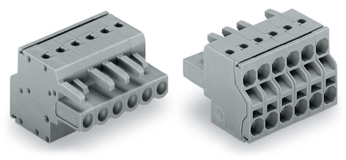 Connettore femmina per 2 conduttori. Push-in CAGE CLAMP®. 2,5 mm2. Passo pin 5 mm. 8 poli. con piastra terminale integrata. 2,50 mm2. grigio