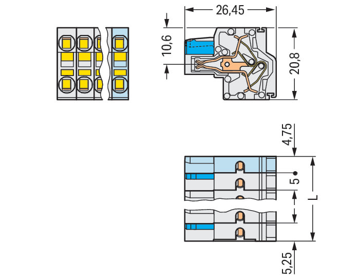 Connettore femmina per 2 conduttori. Push-in CAGE CLAMP®. 2,5 mm2. Passo pin 5 mm. 4 poli. Protetto al 100% contro l'inversione di polarità. con piastra terminale integrata. 2,50 mm2. grigio chiaro