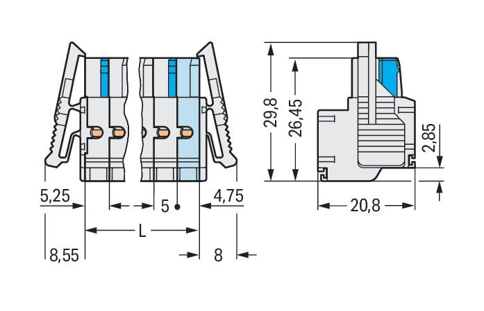 Connettore femmina per 2 conduttori. Push-in CAGE CLAMP®. 2,5 mm2. Passo pin 5 mm. 16 poli. Protetto al 100% contro l'inversione di polarità. Leve di bloccaggio laterali. 2,50 mm2. grigio chiaro