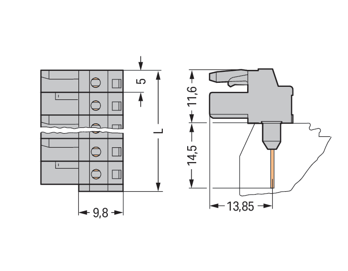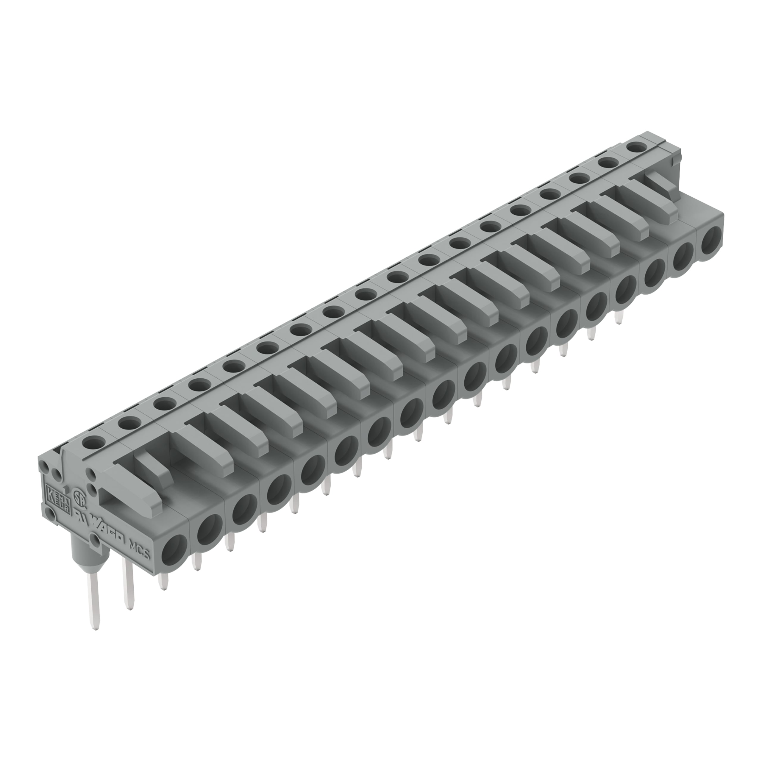 Connettore femmina per morsetti per montaggio su guida. Pin 0,6 x 1 mm. angolato. Passo pin 5 mm. 18 poli. grigio