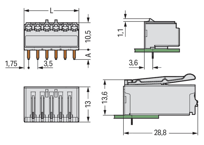 Connettore femmina THT. angolato. Passo pin 3,5 mm. 2 poli. Pin a saldare 0,4 x 0,9 mm. grigio chiaro
