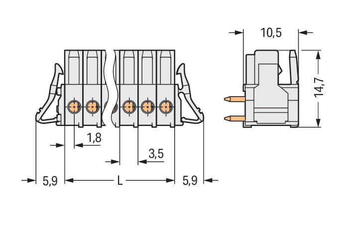 Connettore femmina THT. angolato. Passo pin 3,5 mm. 7 poli. Protetto al 100% contro l'inversione di polarità. Leva di bloccaggio. Pin a saldare 0,9 x 0,9 mm. grigio chiaro