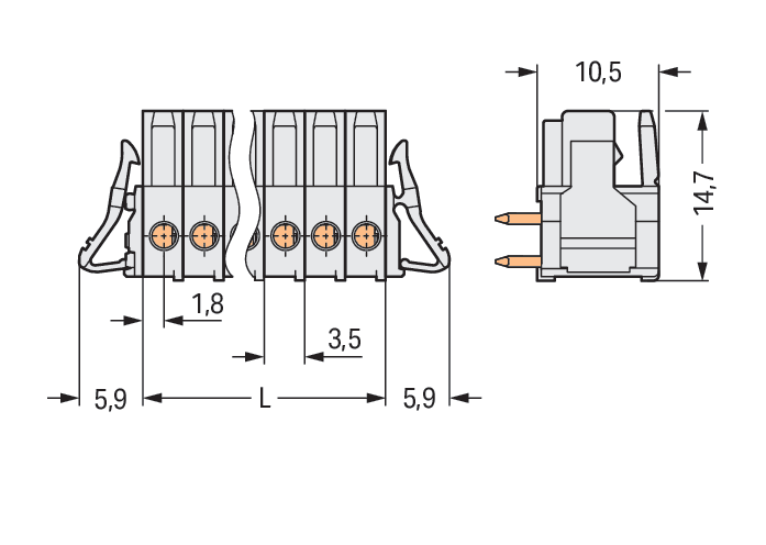 Connettore femmina THT. angolato. Passo pin 3,5 mm. 10 poli. Protetto al 100% contro l'inversione di polarità. Leva di bloccaggio. Pin a saldare 0,9 x 0,9 mm. grigio chiaro