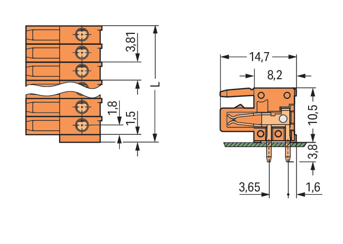 WAGO ELETTRONICA - Connettore femmina THT.angolato.Passo pin 3,81 mm.arancione 734-564