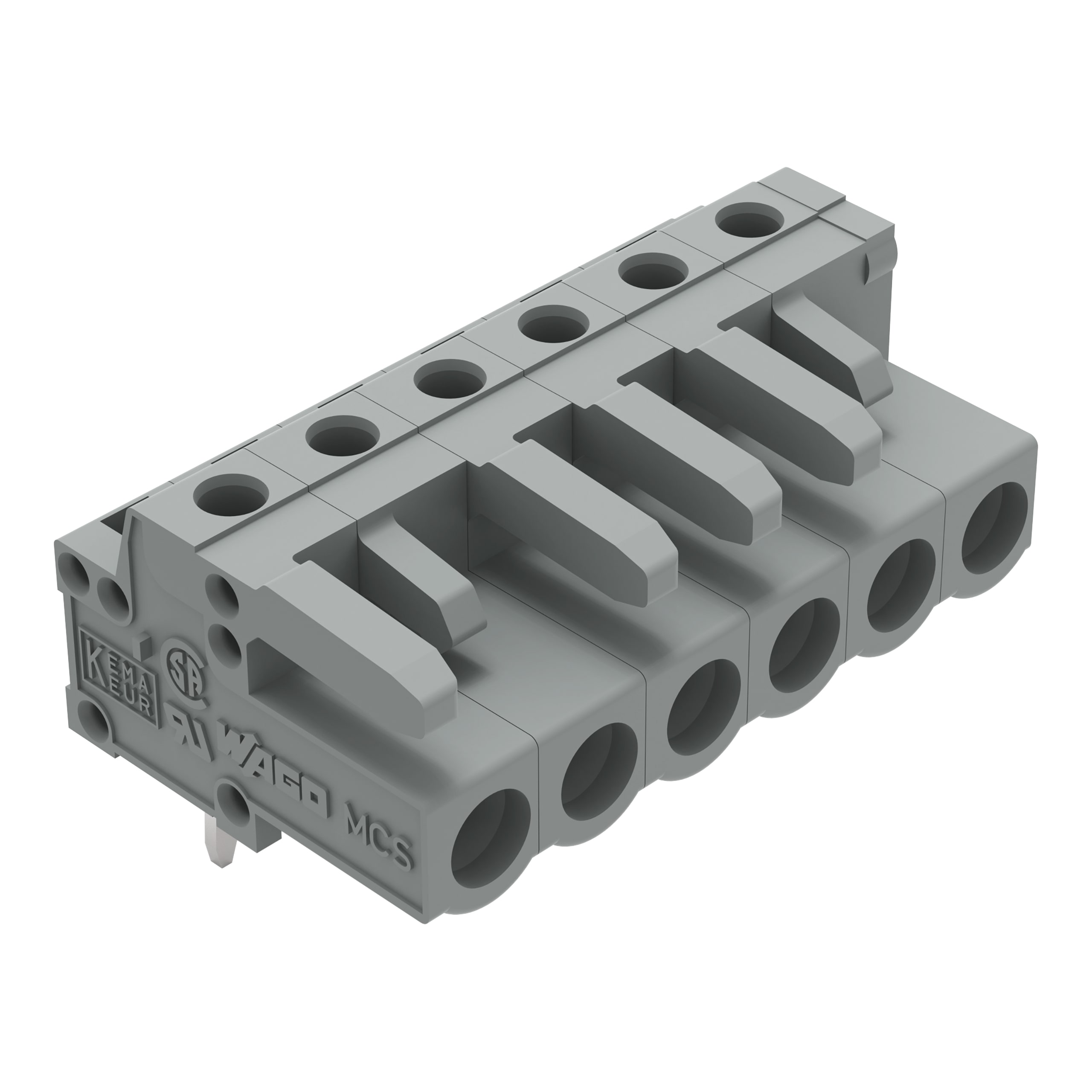 Connettore femmina THT. angolato. Passo pin 5 mm. 6 poli. Pin a saldare 0,6 x 1,0 mm. grigio