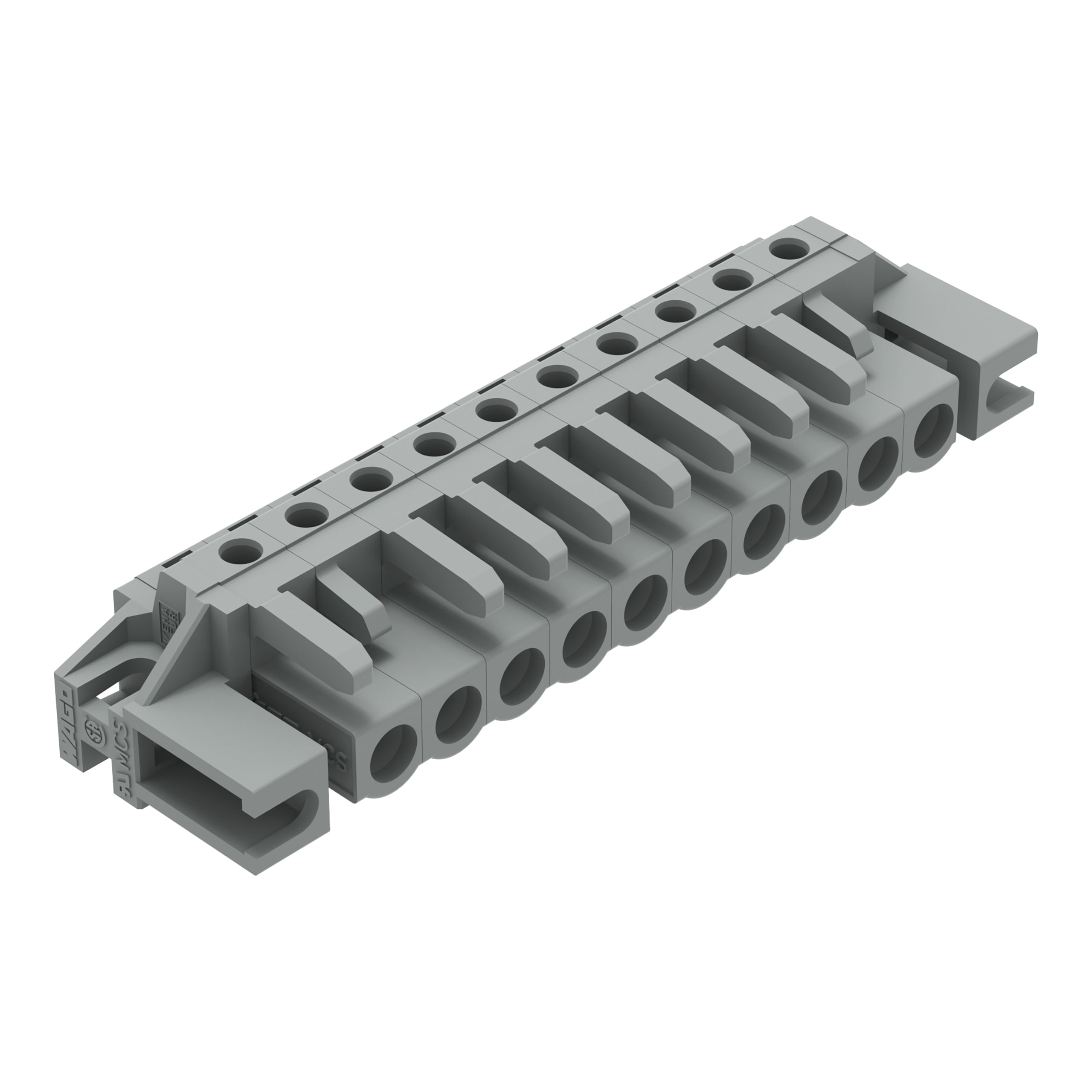 Connettore femmina THT. angolato. Passo pin 5 mm. 10 poli. Flangia distanziale. Pin a saldare 0,6 x 1,0 mm. grigio