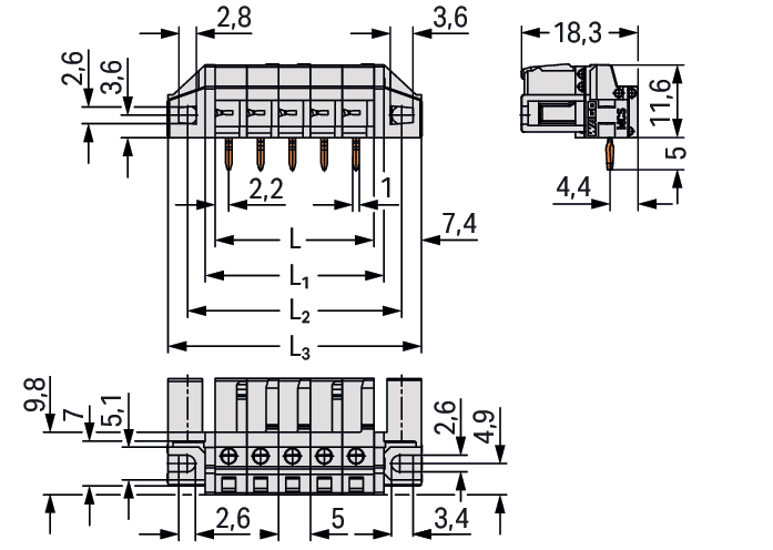 WAGO ELETTRONICA - Connettore femmina THT.angolato.Passo pin 5 mm.grigio chiaro 722-236/047-000