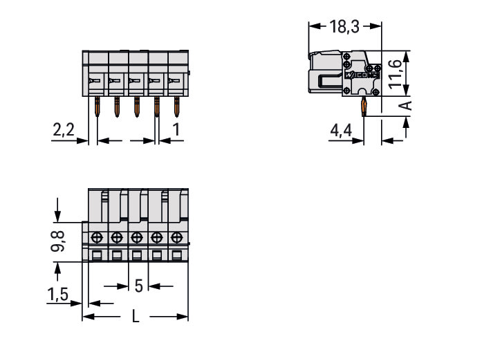 WAGO ELETTRONICA - Connettore femmina THT.angolato.Passo pin 5 mm.grigio chiaro 722-241