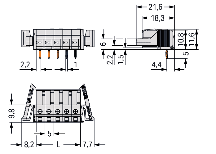 Connettore femmina THT. angolato. Passo pin 5 mm. 16 poli. Protetto al 100% contro l'inversione di polarità. Leva di bloccaggio. Pin a saldare 0,6 x 1,0 mm. grigio chiaro