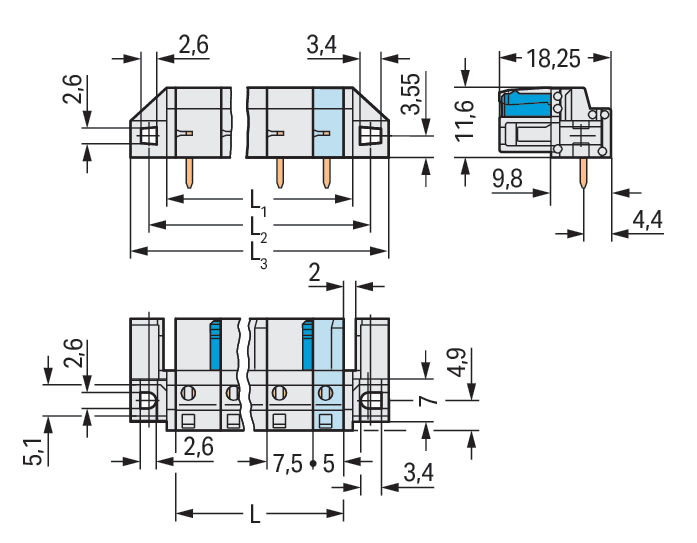 Connettore femmina THT. angolato. Passo pin 7,5 mm. 3 poli. Protetto al 100% contro l'inversione di polarità. Flangia distanziale. Pin a saldare 0,6 x 1,0 mm. grigio chiaro
