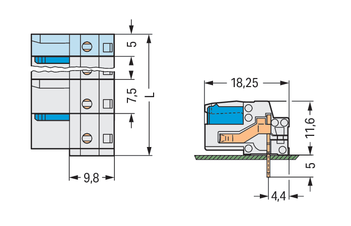 Connettore femmina THT. angolato. Passo pin 7,5 mm. 2 poli. Protetto al 100% contro l'inversione di polarità. Pin a saldare 0,6 x 1,0 mm. grigio chiaro