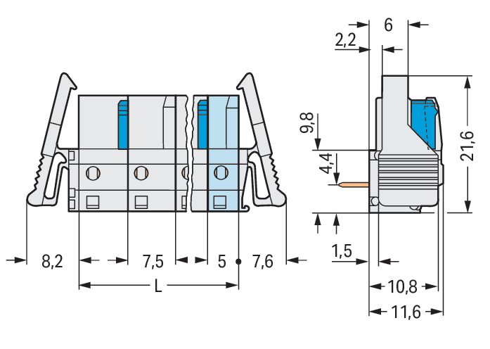 Connettore femmina THT. angolato. Passo pin 7,5 mm. 3 poli. Protetto al 100% contro l'inversione di polarità. Leva di bloccaggio. Pin a saldare 0,6 x 1,0 mm. grigio chiaro