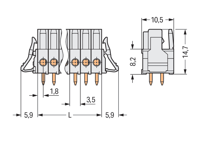 Connettore femmina THT. dritto. Passo pin 3,5 mm. 18 poli. Protetto al 100% contro l'inversione di polarità. Leva di bloccaggio. Pin a saldare 0,9 x 0,9 mm. grigio chiaro