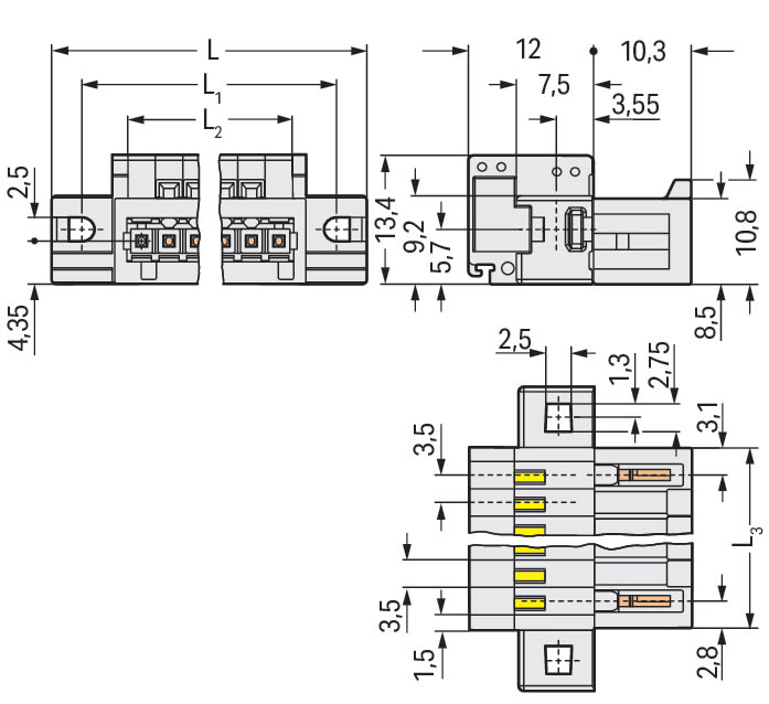 Connettore maschio per 1 conduttore. CAGE CLAMP®. 1,5 mm2. Passo pin 3,5 mm. 3 poli. Protetto al 100% contro l'inversione di polarità. collare di fissaggio. 1,50 mm2. grigio chiaro