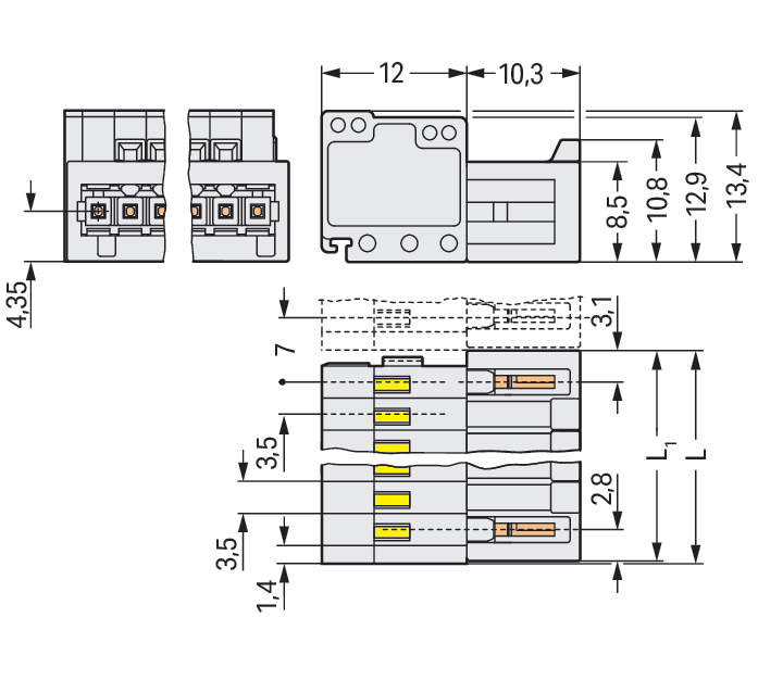 Connettore maschio per 1 conduttore. CAGE CLAMP®. 1,5 mm2. Passo pin 3,5 mm. 18 poli. Protetto al 100% contro l'inversione di polarità. 1,50 mm2. grigio chiaro