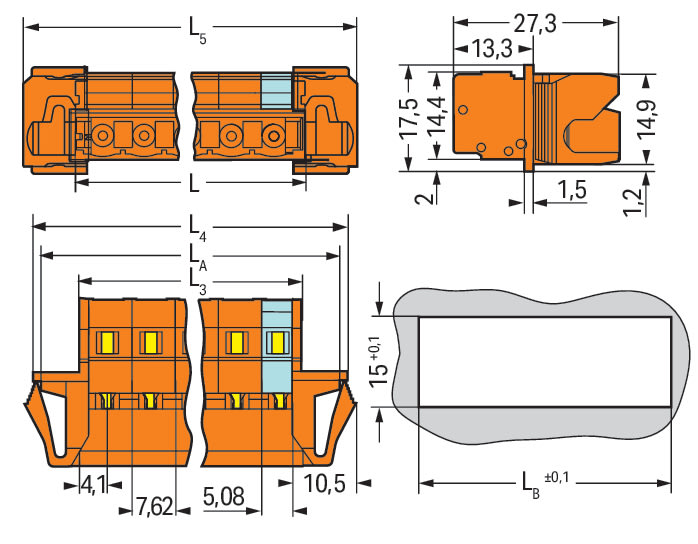 Connettore maschio per 1 conduttore. CAGE CLAMP®. 2,5 mm2. Passo pin 7,62 mm. 2 poli. Flangia a scatto. 2,50 mm2. arancione