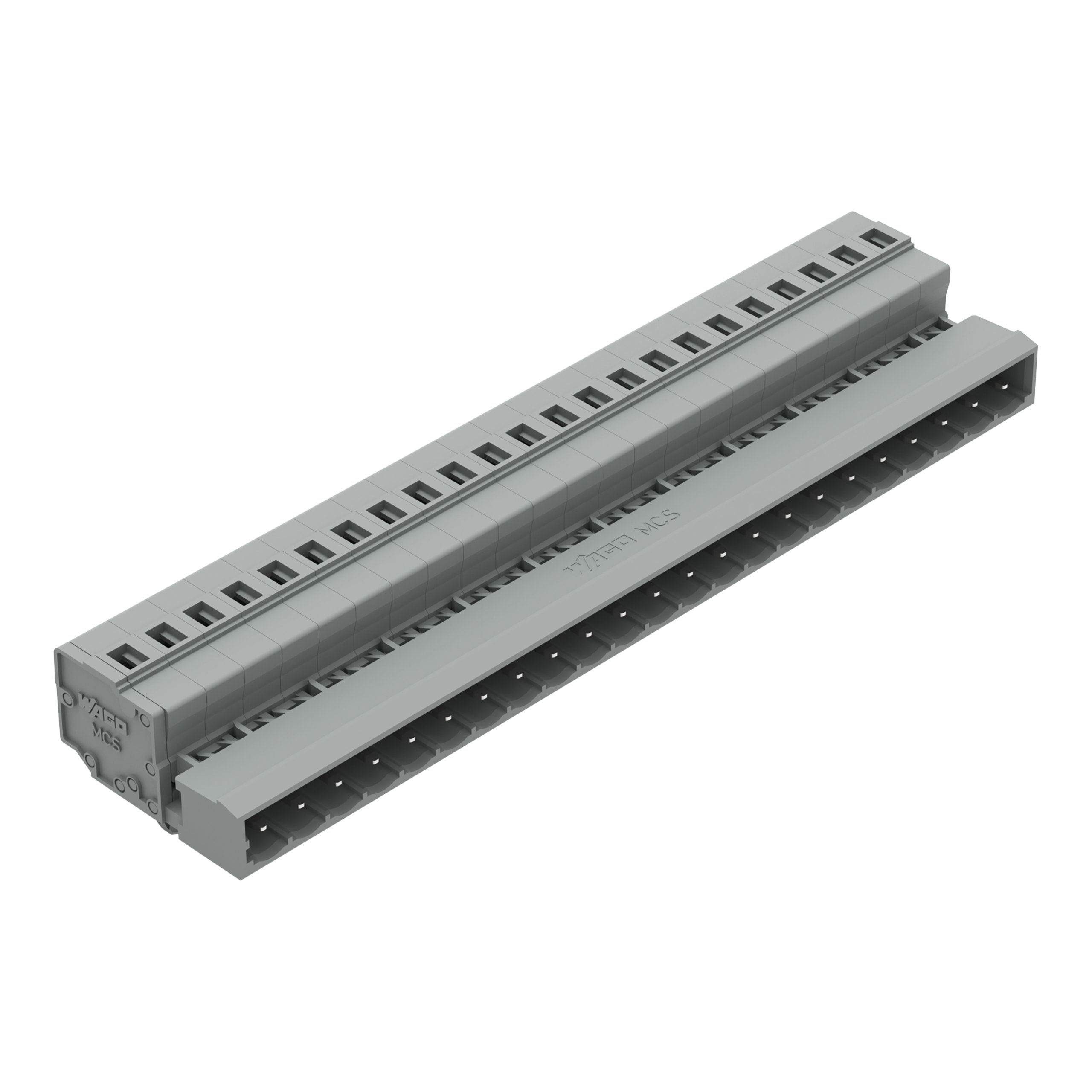 Connettore maschio per 1 conduttore. CAGE CLAMP®. 2,5 mm2. Passo pin 5 mm. 23 poli. Montaggio su guida DIN 35/pannello. Piedi di fissaggio a scatto. 2,50 mm2. grigio